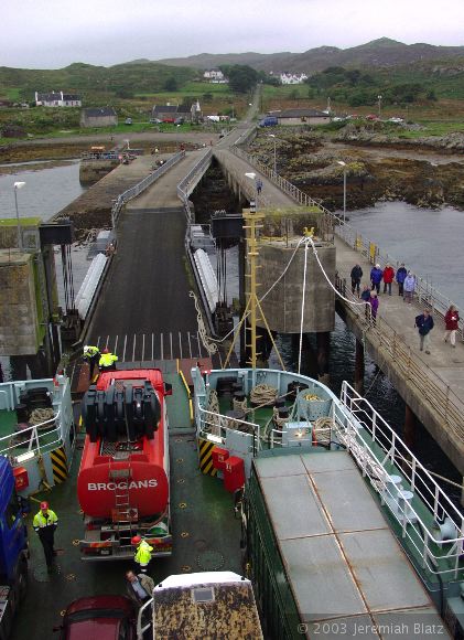 The ferry, stopped at Colonsay. Note the large trucks, this is how the islands get their resources (except for barley, water, peat, deer and sheep).
