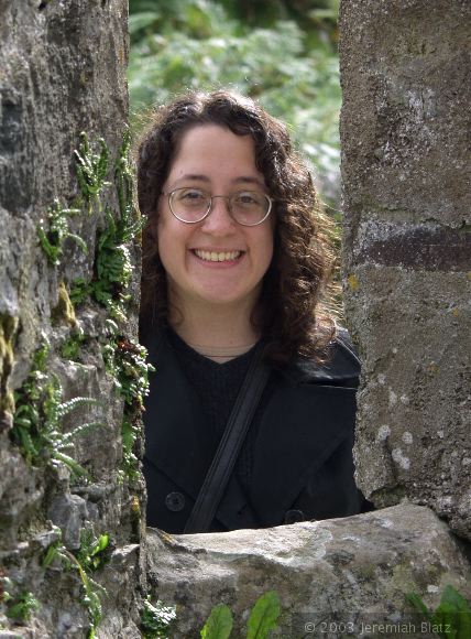 Jess looking through a window of the (roofless) Kildalton chapel, by the similarly-named cross.